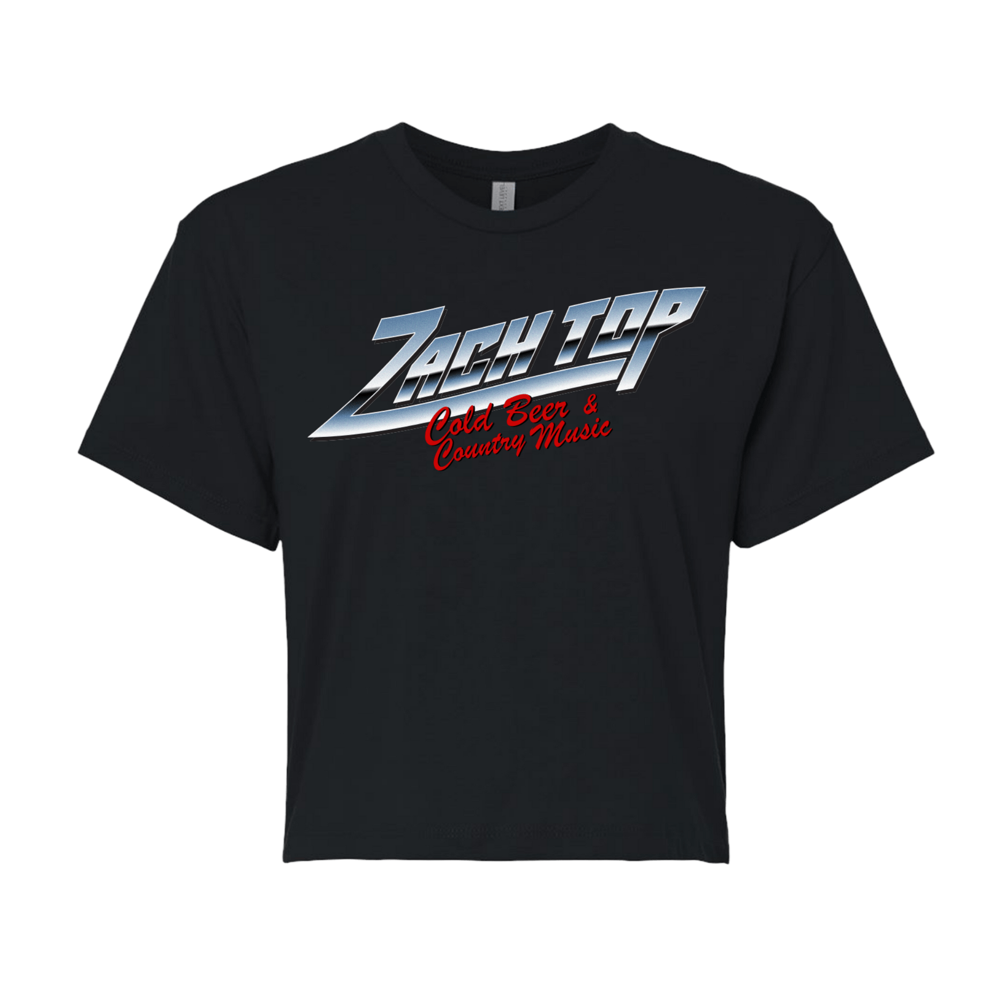 Women’s black crop t-shirt. Premium 60% ring-spun cotton / 40% polyester featuring “Zach Top Cold Beer & Country Music” chrome graphic on the front.