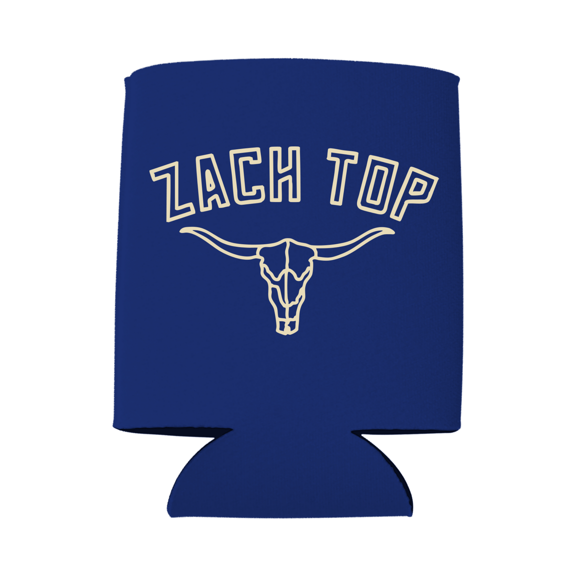 Blue double sided can cooler featuring Zach's logo on one side and "Cold Beer & Country Music" on the other.